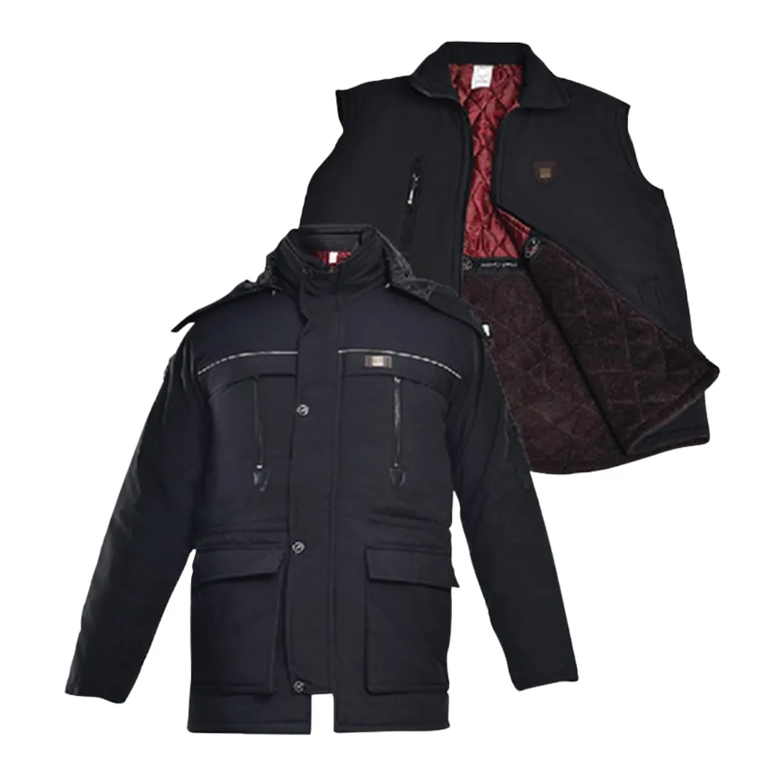کاپشن و جلیقه پاناما با استفاده از پارچه اورکتی ضد آب و سه لایه آستر شامل نمد ۲۵۰ گرم، خز اعلا و شمعی روی پشم شیشه ۲۰۰ گرم، محافظت کامل در برابر سرما، باد و باران را ارائه میدهد. جلیقه داخلی با پشم شیشه ۱۵۰ گرم، لایه اضافی گرما فراهم میکند و کلاه جدا شونده قابل تنظیم راحتی و تطبیق با شرایط مختلف را امکانپذیر میسازد. طراحی حرفهای این پوشاک به کاربران آزادی حرکت میدهد و سر آستین کشبافت، نفوذ باد را به حداقل میرساند. ترکیب مواد با کیفیت و ساختار چندلایه باعث افزایش دوام و طول عمر محصول در محیطهای کاری سخت میشود و ایمنی کارکنان را تضمین میکند.